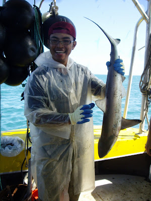 今天smoko剛開始,沒一會就聽見他說『It’s Shark!』靠,沒聽錯吧,全部人都湊過去看,他用力拉著釣魚線,釣魚線在水面上不安分的呈現8字型快速移動著,看得出來這隻魚很有力,拉回來的釣魚線不斷被扯回去水面下,蘭斯不停用他粗壯的手臂快速收回釣魚線,一來一往,討海人和大魚的搏鬥,看得大家目不轉睛。刷~,大魚敗陣,終於被拉出水面,這一瞬間,大家齊喝采,真的是鯊魚!雖然是一隻不到一公尺的小鯊魚,但是卻讓所有人熱血沸騰。